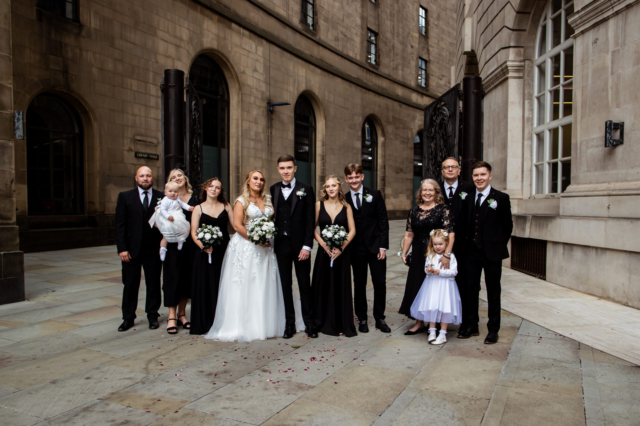 I generally photograph Confetti around the Library walk area. It’s very close to the Register Office and we have the Town Hall and Library as a fantastic backdrop. Following this amazing moment, it’s time for some group shots. I always recommend no more than 10 different group shots which only takes 10 minutes.- you will want to get on with your celebrations.